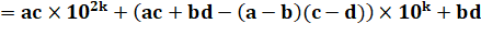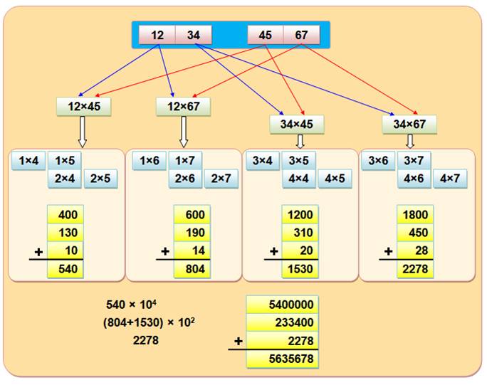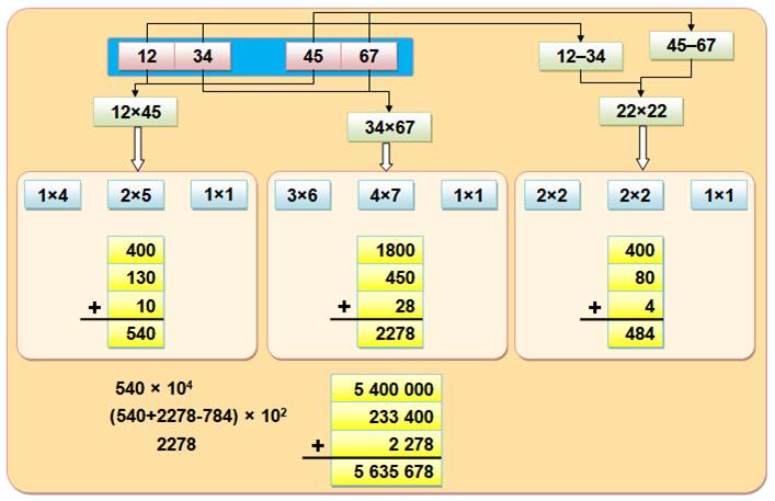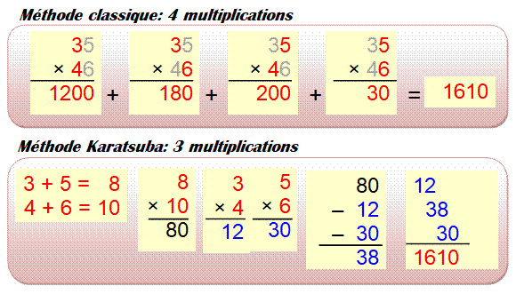 Ex: 1 234 x 4 567 = 12 x 45 x 104 + (12 x 45 + 34 x 67 – (12 – 34) (45 – 67)) x 102 + 34 x 67 = 5 635 678 |