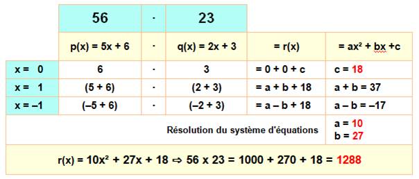 Exemple (simple!) 56 x 23 p(x) = 5x + 6 et qx = 2x + 3 avec x = 10 r(x) = p(x) q(x) = ax² + bx + c Évidemment on peut calculer le produit du polynôme: r(x) = 10x² + 27x