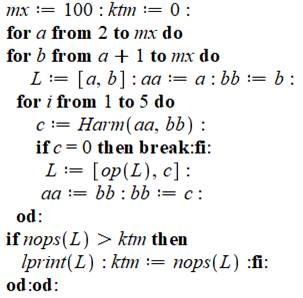 Chaines harmoniques les plus grandes (records) [2, 3, 6] [3, 4, 6, 12] [10, 12, 15, 20, 30, 60] [60, 70, 84, 105, 140, 210, 420] [105, 120, 140, 168, 210, 280, 420, 840] [252, 280, 315, 360, 420, 504, 630, 840, 1260, 2520] [2310, 2520, 2772, 3080, 3465, 3960, 4620, 5544,