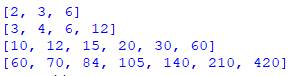 [2, 3, 6] [3, 4, 6, 12] [3, 5, 15] [4, 6, 12] [4, 7, 28] [5, 8, 20] [5, 9, 45] [6, 8, 12, 24] [6, 9, 18] [6, 10, 30] [6, 11, 66] [7, 12, 42] [7, 13, 91] [8, 12, 24] [8, 14, 56] [8, 15, 120] [9, 12, 18, 36] [9, 15, 45] [9, 16, 72] [9, 17, 153] [10, 12, 15, 20, 30, 60] [10, 15, 30] [10, 16, 40] [10, 18, 90] [10, 19, 190] |
