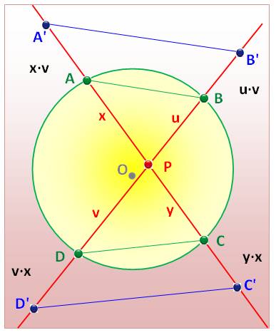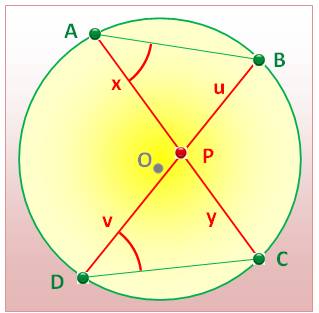 coupent selon la relation: xy = uv ou équivalent Deux sécantes passant par un point P du cercle,