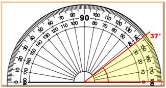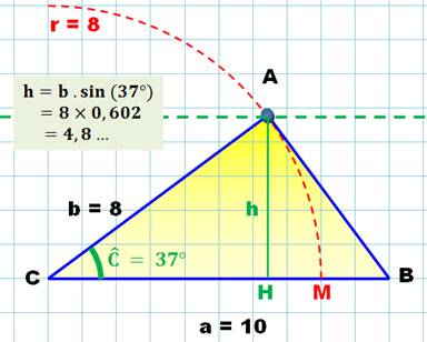 Connaissant l'angle de 37°, on calcule la longueur de la hauteur AH. Mesure de 37° avec le rapporteur