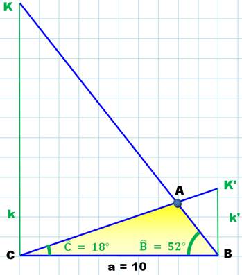 k = a . tan (52°) = 10 x 1,28 = 12,8 unités. k' = a . tan (18°) = 10 x 0,325 = 3,25 unités.