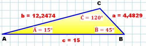 s = ½ (4,4829 + 12,2474 + 15) = 15,8651… A² = s