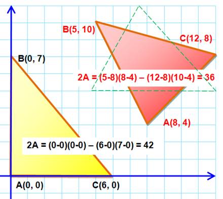 ½ (6 x 7) = 21. Triangle rouge: Aire = 36 / 2 = 18; Valeur vérifiable graphiquement. Le triangle vert est égal au rouge à une