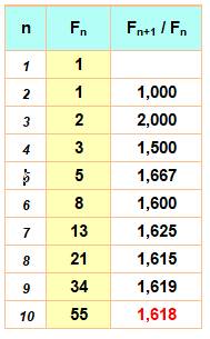 nombres de Fibonacci successifs tend vers le nombre d'or: 1, 618… Ainsi 89 / 55 = 1,