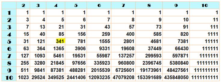 = 1 + 4 + 16 + 64 + 256 = 341 1 + 10 + 100 + 1 000 = 1 111 1 + 2 + 4 + 8 + 16 + …+ 1 024 = 2 048 – 1 = 2 047 |