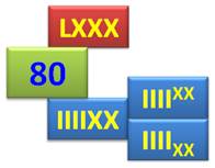 notation classique des Romains (LXXX) pour le nombre 80. En bas, en bleu, les