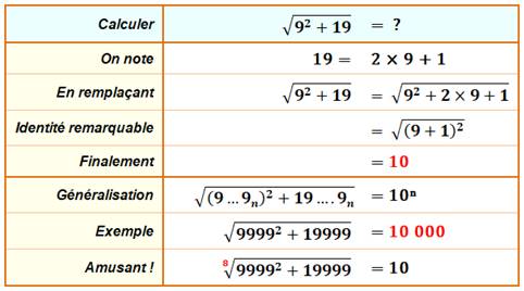 81 + 19 = 100 et sa racine est 10. Mais, il est généralisable à de grands nombres. Exemple Problème présenté