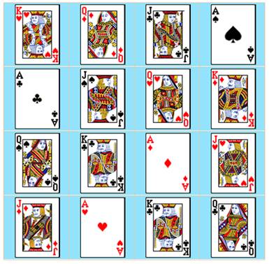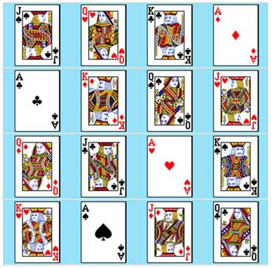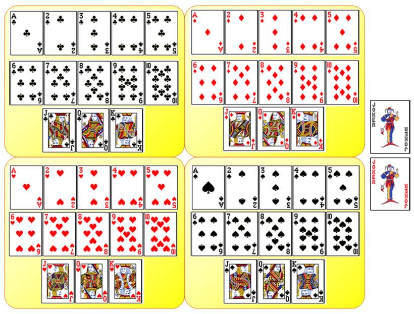 cartes de la même enseigne, chacune valant de 1 à 10, valet, dame et roi. |