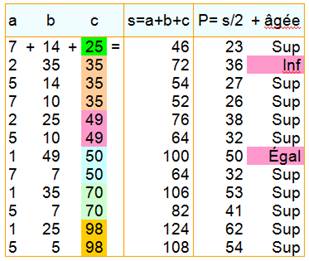 premier cas: 7, 14, 25. Voyons maintenant l'âge du capitaine: P = (a+b+c) /2. Et indiquons les cas pour lesquels la fille aînée est