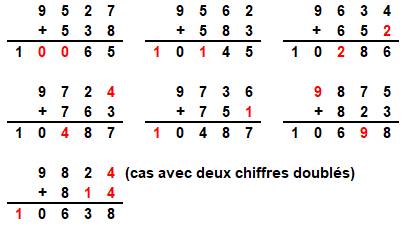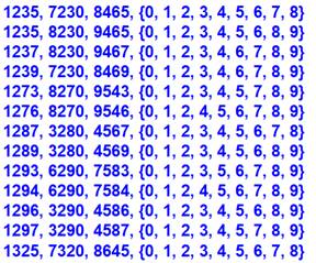 Conclusion, toute solution comportera tous les chiffres de 0 à 9, sauf un. Quelques solutions avec