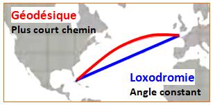 Loxodromie: ligne droite entre deux points sur une carte Mercator. Courbe