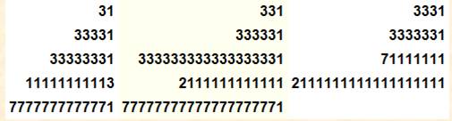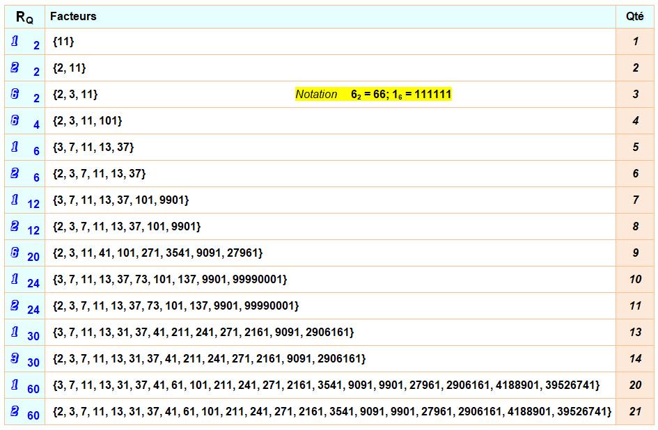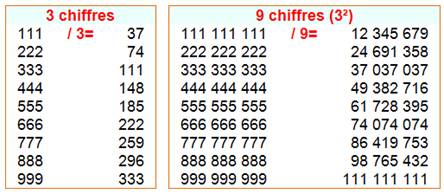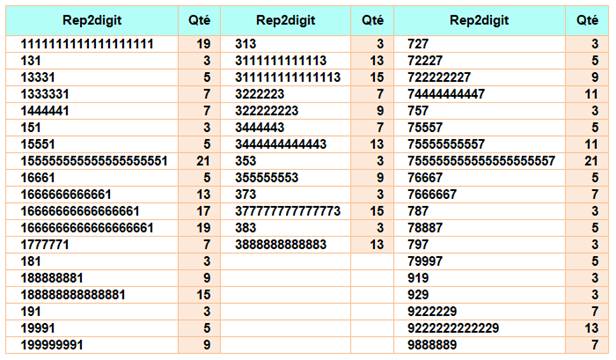 répétés, comme 3333 ou 555 … Les nombres avec des 1 (repunits) sont ceux