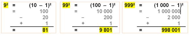 De sorte que, par exemple, 999² = 998 001 Avec cette coquetterie: 999 = 998 + 001, valable pout tous
