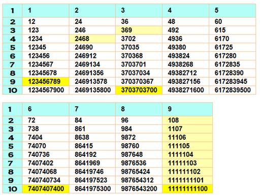 Tableau des valeurs k + kk + kkk + … Lignes pour n = quantité de termes de la somme Colonnes pour k, le type de repdigit. Exemple de lecture 6 + 66 + 666 + … + 6666 666 666 = 7 407 407 400 Notez la régularité