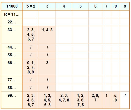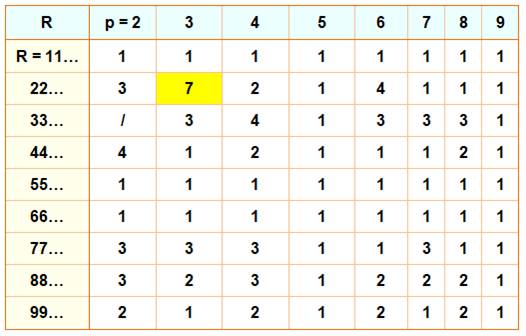 puissance p ne comporte jamais les chiffres indiqués dans la zone rose. Exemple 333…3 n'a pas les chiffres (1, 4 et 8) 333 = 35 937 3333 = 36 926 037 33333 = 37 025 927 037 etc. Tableau testé jusqu'à mille chiffres dans chaque repdigit. |