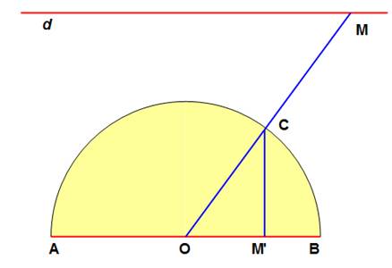 autant sur le demi-cercle ACB, d'ailleurs. On trace OM puis CM'. À tout point M de d correspond un