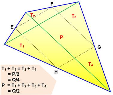 somme des aires des quatre triangles périphériques. Les médianes EG et FH se