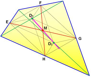 milieux des diagonales D1 et D2. Ces trois points sont alignés. Notez les parallélogrammes: FD1HD2. La