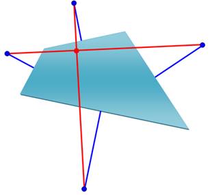 points (bleus) Les deux droites (rouges) réunissant ces quatre points, deux, à deux,