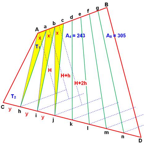 espacées également de la quantité y, nous avons: h2 = h3 = h. L'aire des triangles jaunes