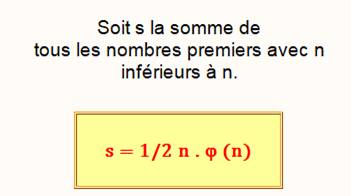 somme s = 1 + 5 + 7 + 11 = 24 φ(12) = 4 Calcul de s s = 1/2 x 12 x 4 = 24 |
