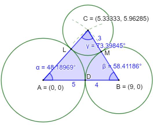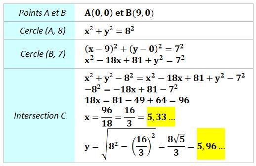 dessiner deux cercles de rayon 5 + 3 = 8 et 4 + 3 = 7. Calculons les coordonnées du point C. |