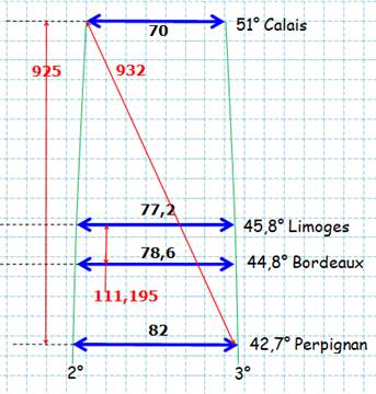 pour une tranche de longitudes entre 2° et 3°. Les valeurs indiquées (en km) ont