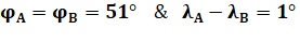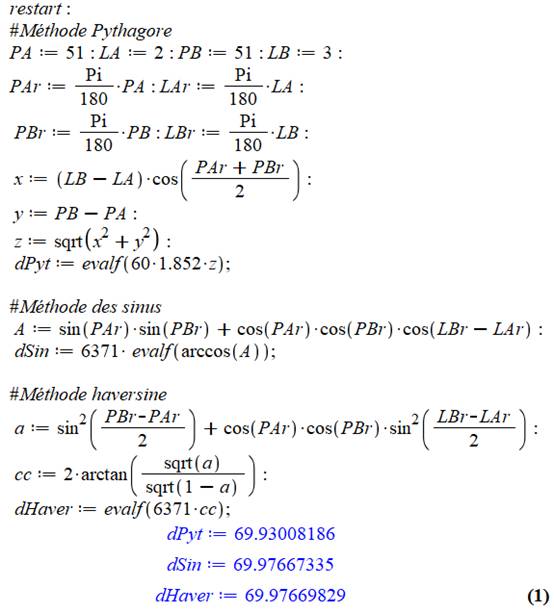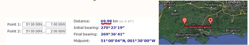 Exemple pour 1° de longitude à la latitude 51° a = 0,000030159… c = 0,010983… d = 69,9767 … km |
