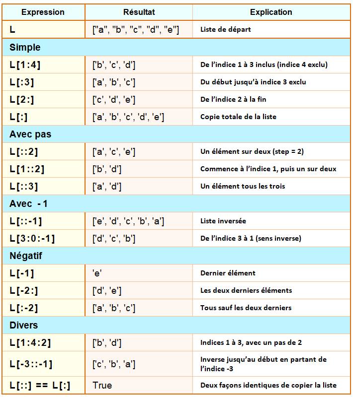 et Tableau de possibilités print(L[:2]) # Prend tous les éléments