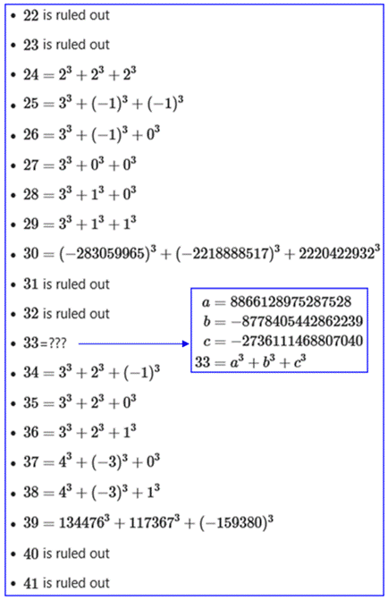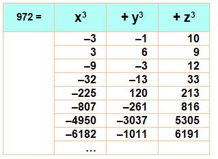 = 8 866 128 975 287 5283 + (–8 778 405 442 862 239)3 + (–2 736 111 468 807 040)3 = (6,969… – 6,764… – 0,205…) 1047 Obtenue après trois jours de calculs sur un superordinateur |